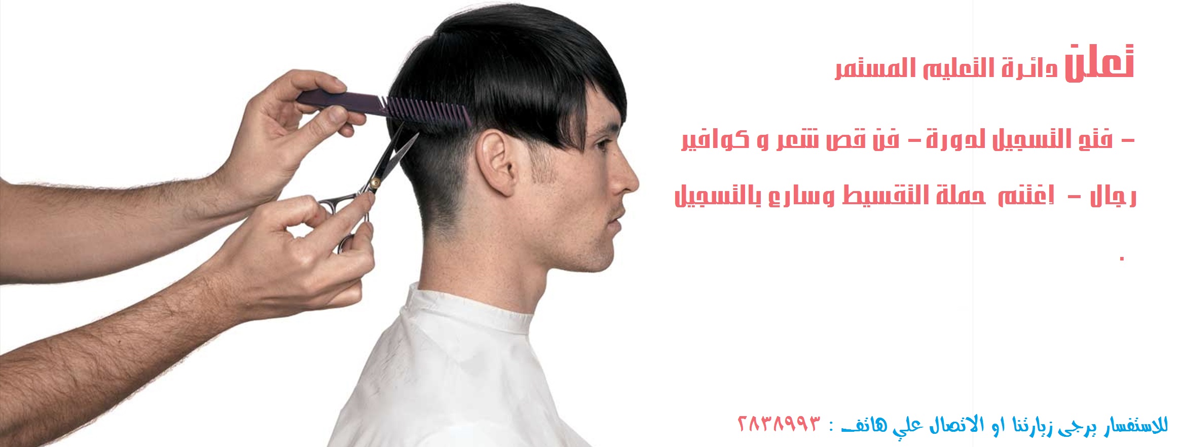 تعلن دائـرة التعليم المستمر - فتح التسجيل لدورة- فن قص شعر و كوافير رجال - إغتنم حملة التقسيط وسارع بالتسجيل . للاستفسار يرجى زيارتنا او الاتصال علي هاتف :2838993