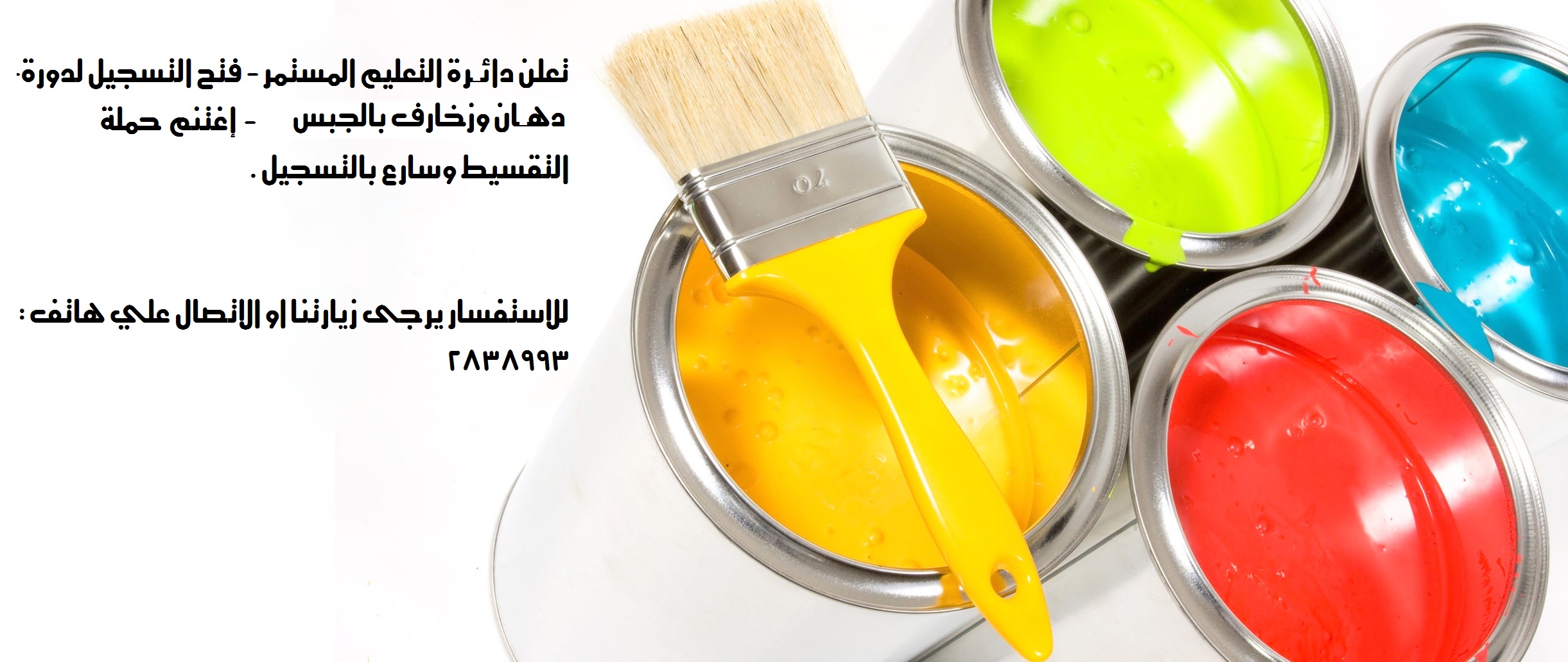 تعلن دائـرة التعليم المستمر - فتح التسجيل لدورة- دهان وزخارف بالجبس - إغتنم حملة التقسيط وسارع بالتسجيل . للاستفسار يرجى زيارتنا او الاتصال علي هاتف :2838993