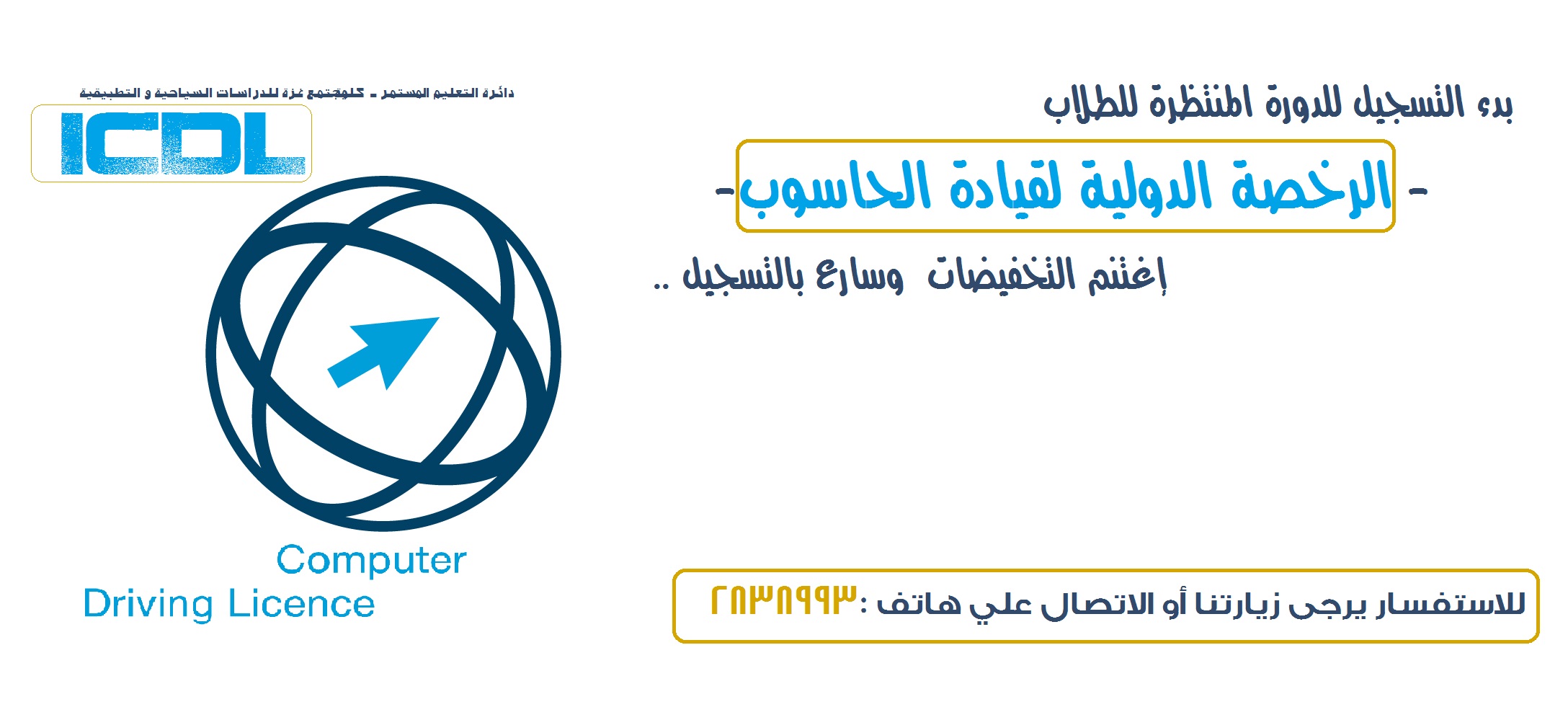 بدء التسجيل للدورة المنتظرة - ICDL - إبتدأءا من يوم السبت وحتي نهاية الاسبوع إغتنم التقسيط وسارع بالتسجيل . للاستفسار يرجى زيارتنا او الاتصال علي هاتف :2838993