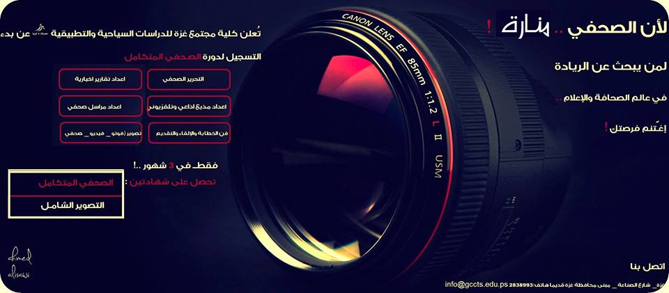 تعلن دائرة التعليم المستمر -كلية مجتمع غزة للدراسات السياحية و التطبيقية عن فتح ابواب التسجيل لدورة الصحفي المتكامل , كما وستمنح الكلية فرص تدريب وتطوع للملتحقين , بأسعار مخفضة , المقاعد محدودة العنوان : غزة - أول شارع الصناعة مبنى محافظة غزة سابقاً هاتف:2838993 info@gccts.edu.ps http://www.tcsc.ps/